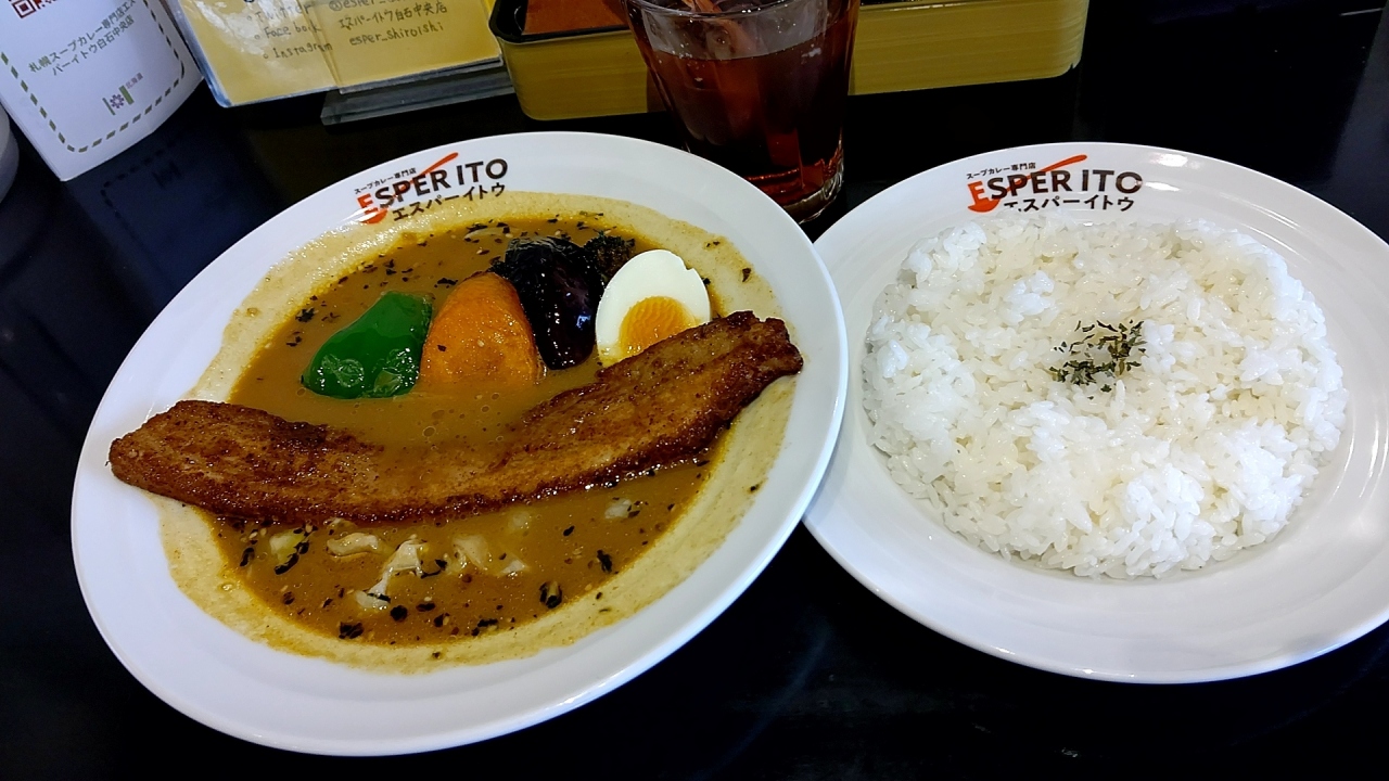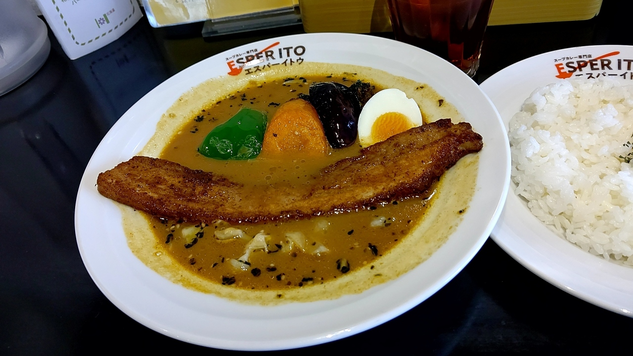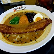 エスパーイトウ特製スパイスに漬け込んだ厚切り豚バラ肉がドカンッと入っていて、迫力があります。