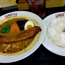 こだわりのパリパリチキンが人気のお店で、鶏・豚と香味野菜の出汁をふんだんに使ったスープカレーはあっさり且つコクがある味わいです。
