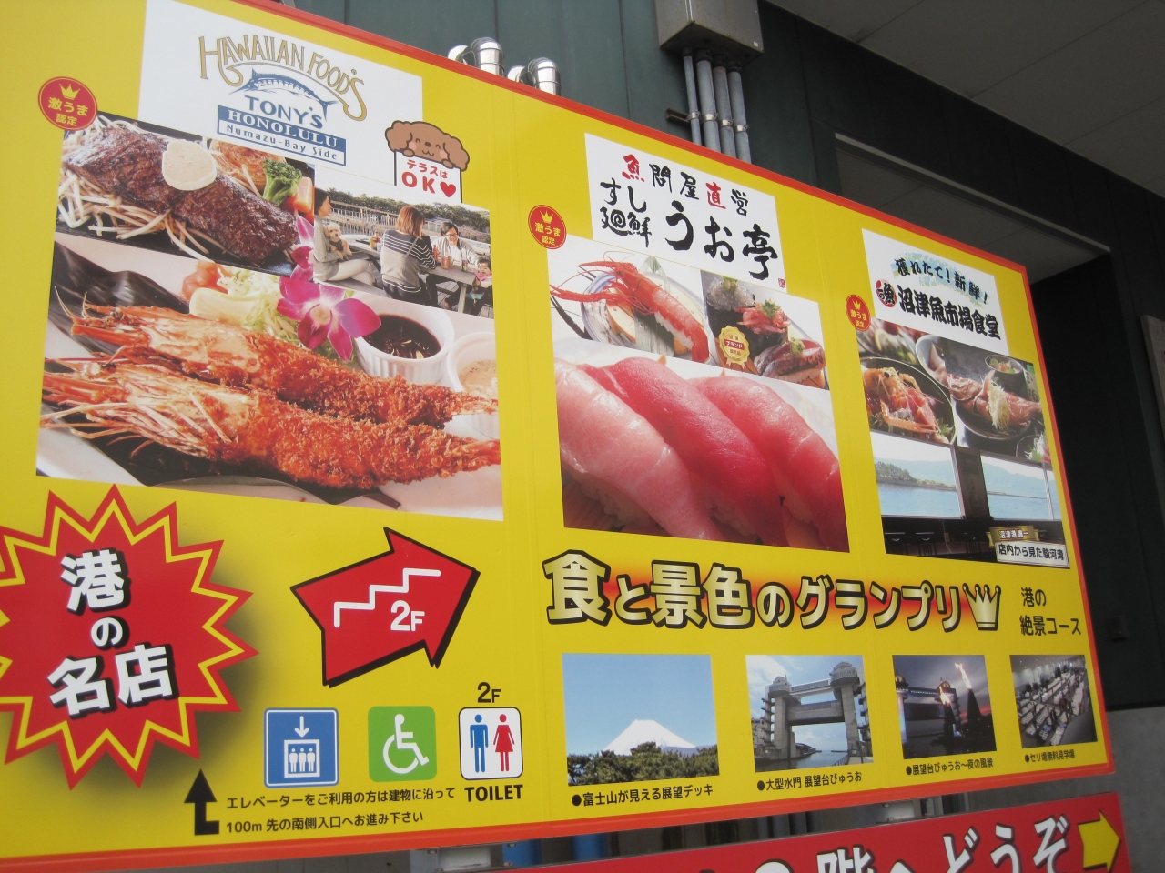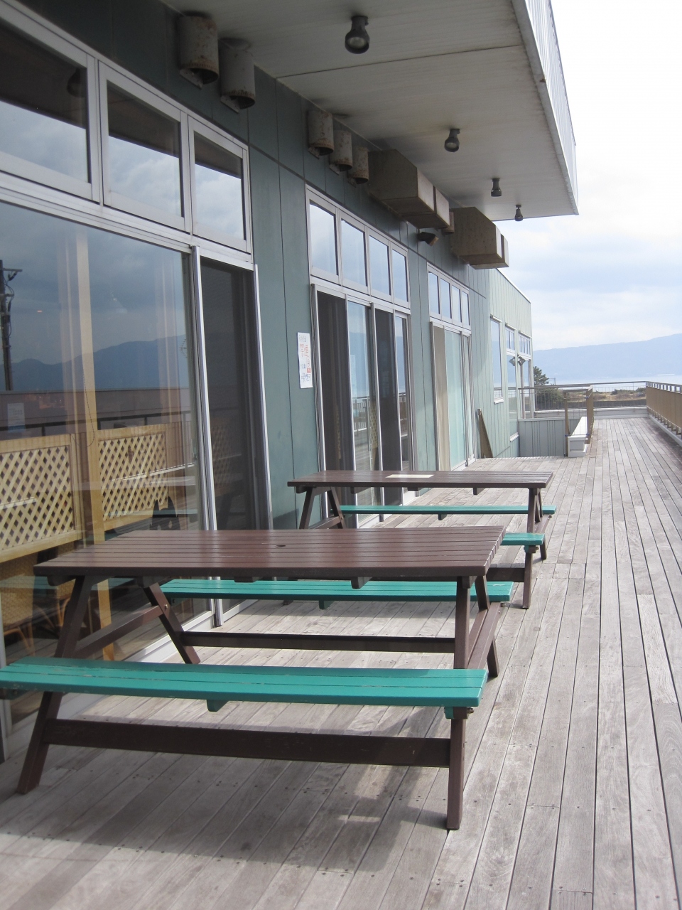 展望デッキ、という看板に沿って階段を昇ると、椅子とテーブルがあり、そこからもびゅうを見られるのですが、よく見ると、デッキの中のハワイアンレストランを利用してる人がデッキに出てきているようでした。中に入りお手洗を借りましたが、そのハワイアンレストラン以外はお店は営業していないように見えました。