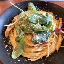 レギュラーメニューはチェーンで同じものが多いですが、今回はおすすめランチパスタセットを注文。 今までに食べた事ナイ、出汁の味がきいたペペロンチーノを頂きました。 個人的にペペロンチーノを自分から食べることなんてほぼナイのに、何故か惹かれて、ベビーリーフときのことベーコンのチーズペペロンチーノを注文。 今までに食べた事ないタイプのパスタではありましたが、めちゃくちゃ美味しかったです!