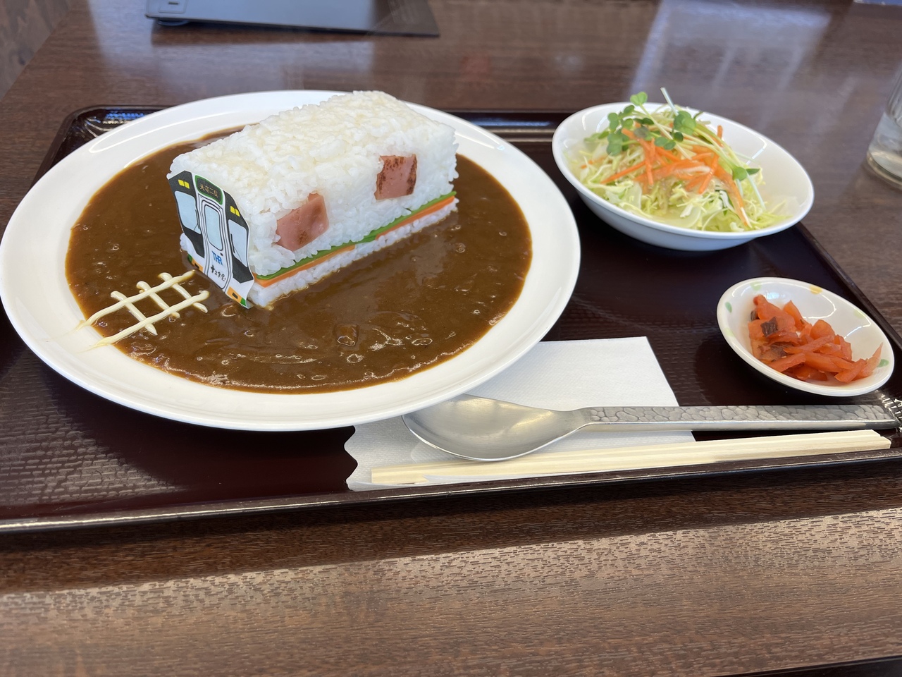 天竜浜名湖鉄道の天竜二俣駅の近くにある食の駅(食堂)。駅に併設されているホームラン軒と迷ったが、こちらへ。転車台カレー1,100円を発注。カレーだからすぐ出てくるはずという期待は裏切られ、次の列車ギリギリになって出てきた。あわててかきこんだが、やや辛めな印象。ライスに貼ってあるシールのようなやつも食べられるとのこと。ま、おぢさんが発注するとやや恥ずかしい。