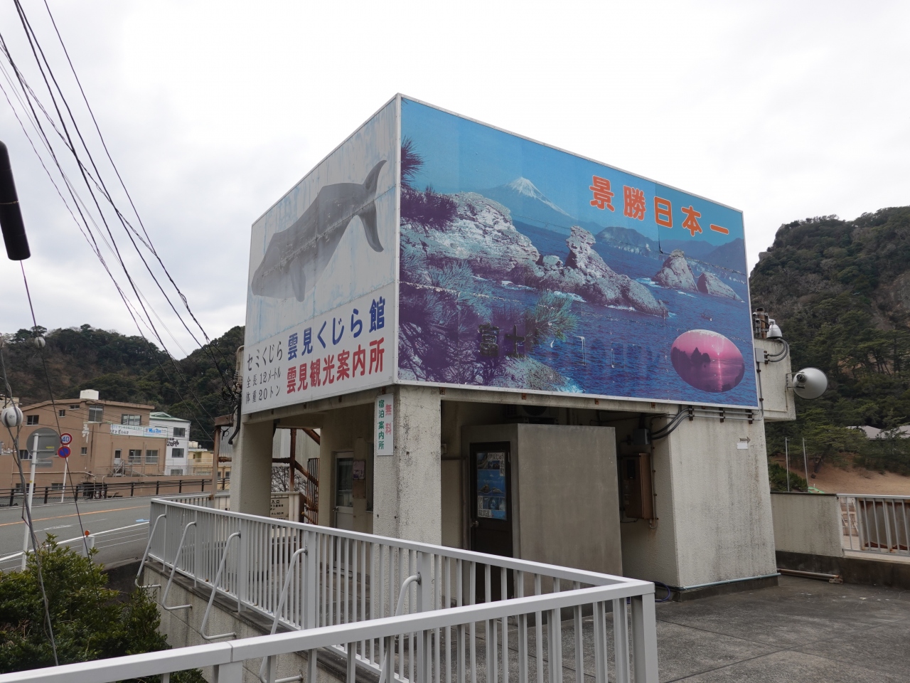 千貫門や晴天の日の富士山など、風光明媚なことで有名な雲見海岸。その雲見海岸を上から見下ろせる場所に雲見くじら館があります。車も三台ほど停車できると思います。週の半分くらいは、閉まっているので、確かめてから行かれるとよいと思います。1977年雲見港に迷い込んだ、セミクジラの骨格標本があります。全長12mあるそうです。