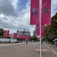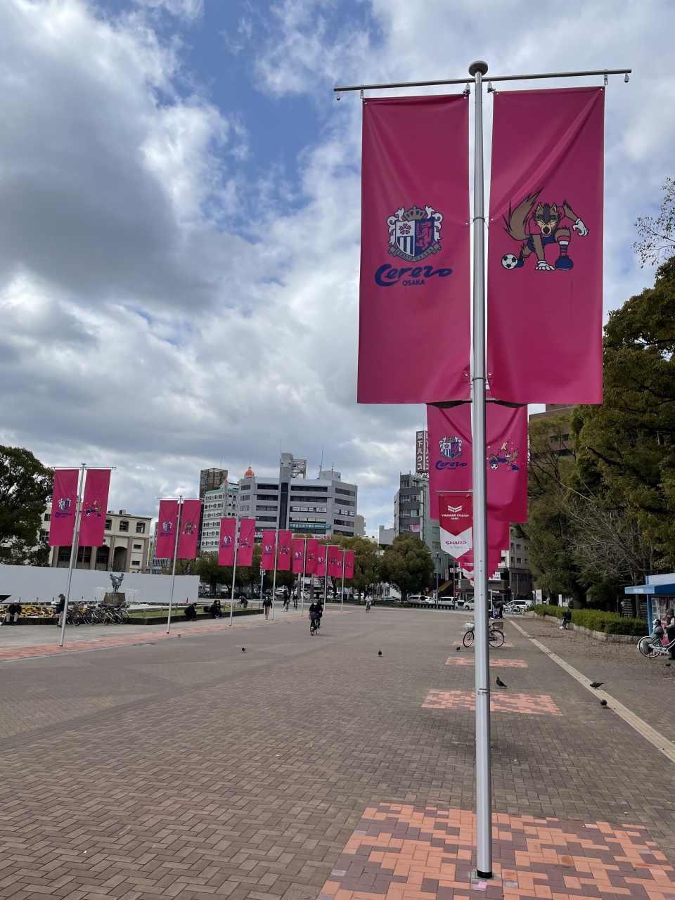 公園南西の入口には、Jリーグが開幕したのでポールにセレッソ大阪チームロゴやキャラクター「ロビー」の様々なポーズが描かれたタペストリーがたくさん掲げられていました。