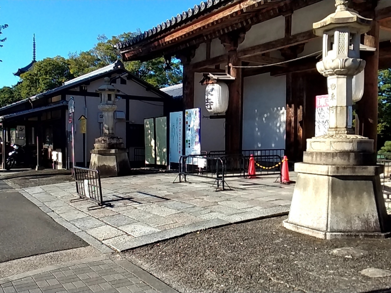 東寺の東側ににある門です。「秋の特別拝観、東寺の星マンダラ」という大きな看板が立っていました。でも、9月中旬の時期だったので、境内は閑散としていました。慶賀門は、鎌倉時代前期に造られた門で、国の重要文化財に指定されています。