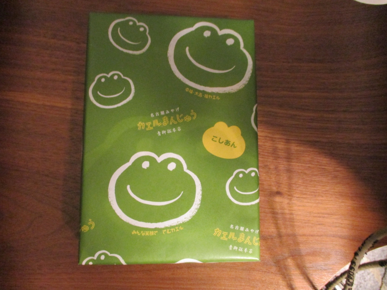 名古屋に行ったらぜったい買おうと思っていたものの一つがこちらのお店の「カエルまんじゅう」です。愛らしいルックスのおまんじゅうで、これは買わなくてはと思いました。家に帰ってさっそくいただきましたが、思ったより甘くなく、あっさりとした味でした。あっというまに食べてしまいました。カエルの目など一つひとつ職人さんが焼き鏝でつけられているとか。もっと買えばよかったです。包装紙もかわいいです。