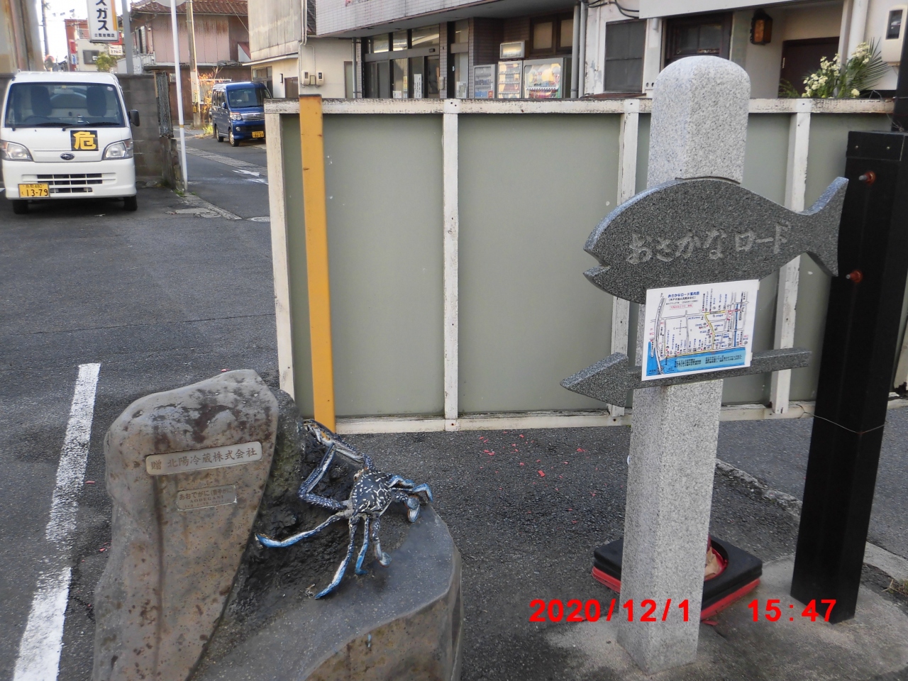 米子市境港観光で立ち寄りました。おさかなロー は、境港で水揚げされた魚のオブジェが並ぶ通りを指していて、水木しげるロードから逆Z字形に展開してました。海寄り部分は境水道沿いの海岸通りの一部が含まれてました。ギンザケなどは地図の端の方にある水産会社の前にありましたが、目立ちにくい程度の大きさのオブジェでした。