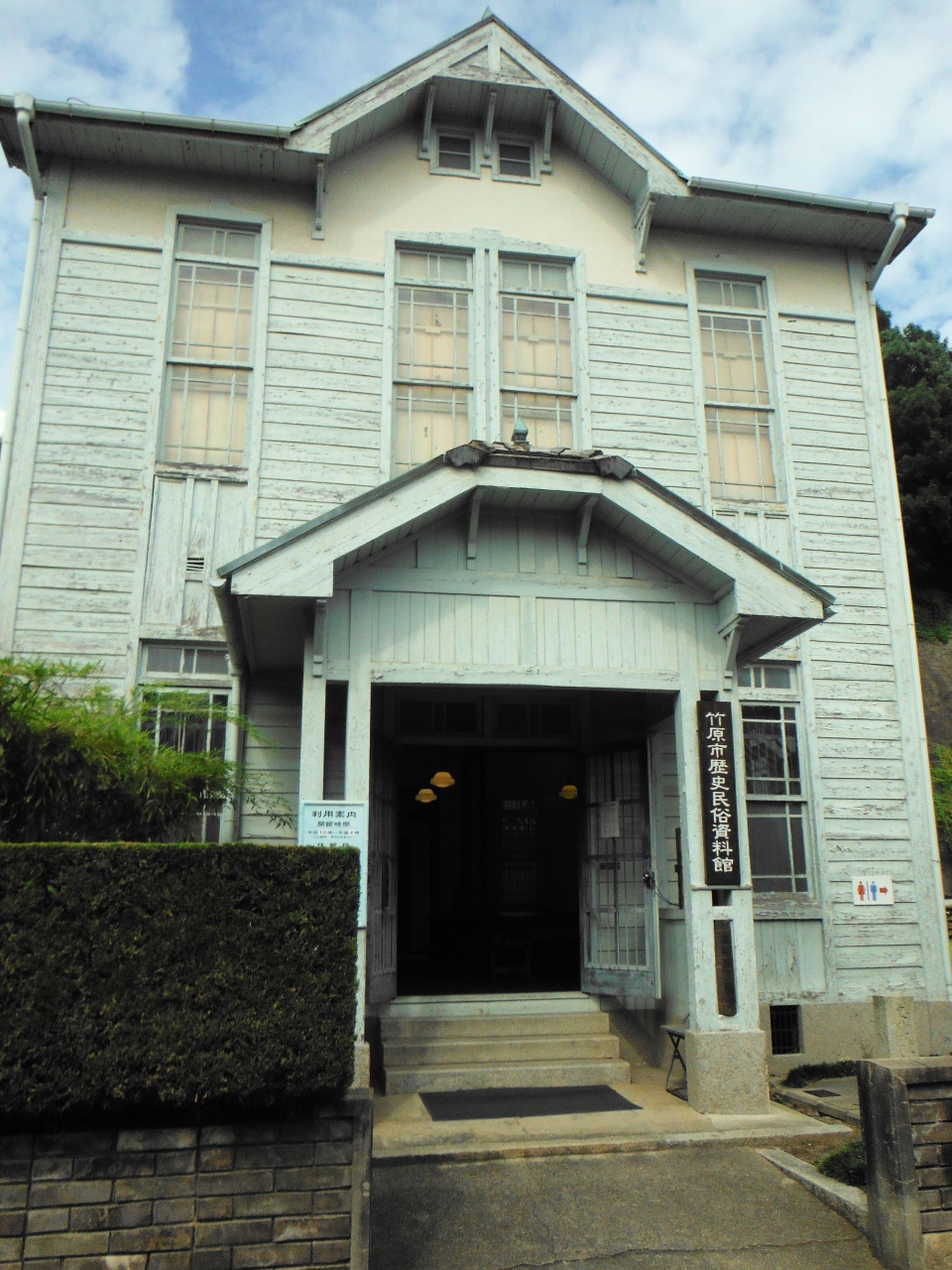 たけはら町並み保存地区にある、珍しい薄い水色の洋風の建物です。