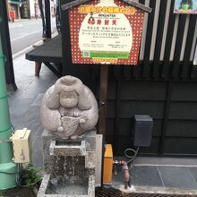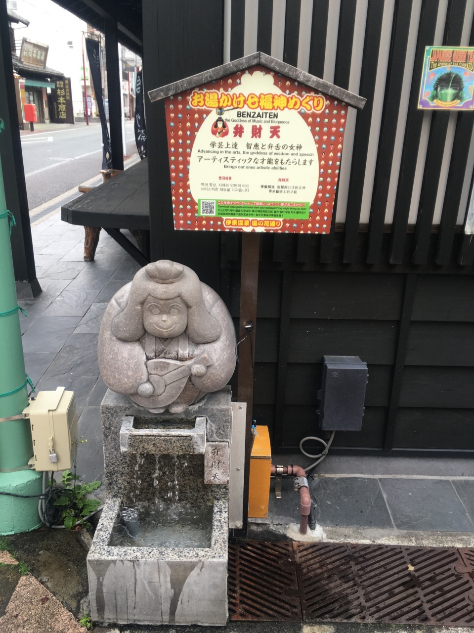 伊東駅前から続く「湯の花商店街」には「お湯かけ七福神めぐり」が設定されており点在する七福神を探しながら商店街を歩くことができます。足湯ならぬ「手湯」ですね。弁財天は商店街の出口付近にあります。音楽や芸能の女神でが、デフォルメされたユニークで可愛い石像でした。