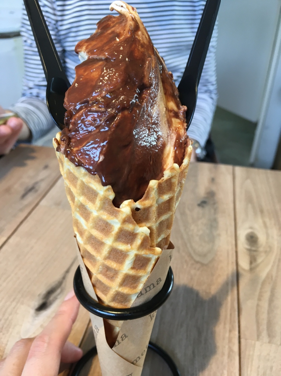 旧製陶所をリノベーションしてオシャレ西の原エリアの一角にあるアイス屋さん。卵のアイスが有名とのことで卵アイスが挟まれたシューアイスと金柑チョコレートのソフトクリームを店内でいただきました。金柑チョコレートはオレンジピールチョコのようで美味しかったです。