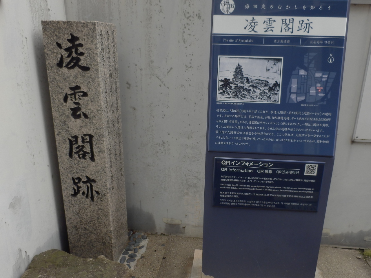 明治時代に木造高層展望塔のブームにあやかって大阪にも凌雲閣が建てられた、ここは木造9階建て(39m)、建築基準法等全くないので好きなことがてきた、この付近今茶屋町と呼んでいるが当時は北野と云った、当時としては北野は歓楽街、料亭も多数あったとされている昭和の初めに撤去された(注)現地に大阪市が設置した説明板参照