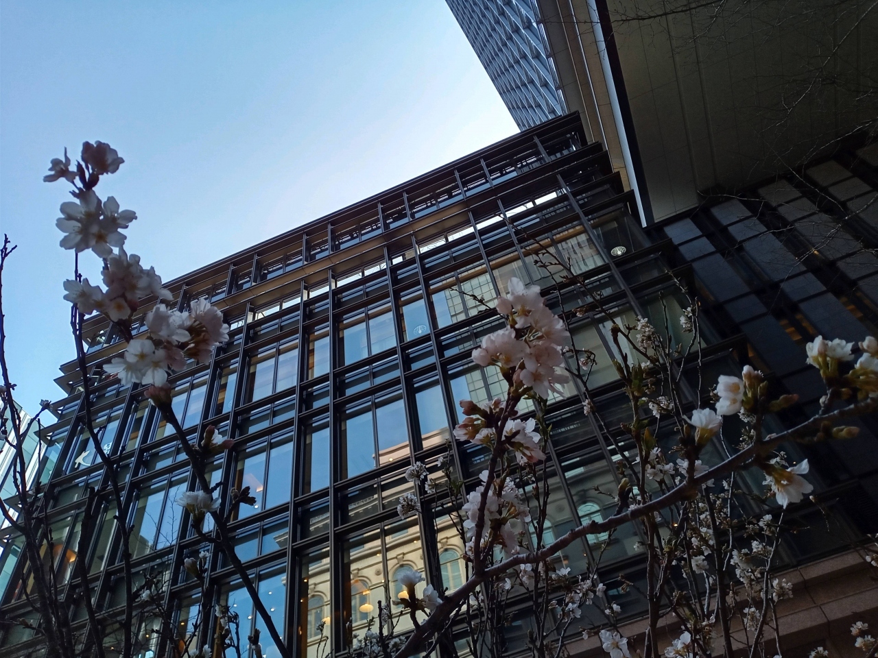 東京・京橋にある『京橋エドグラン』に、『桜』があり、桜の花が咲き初めていました。