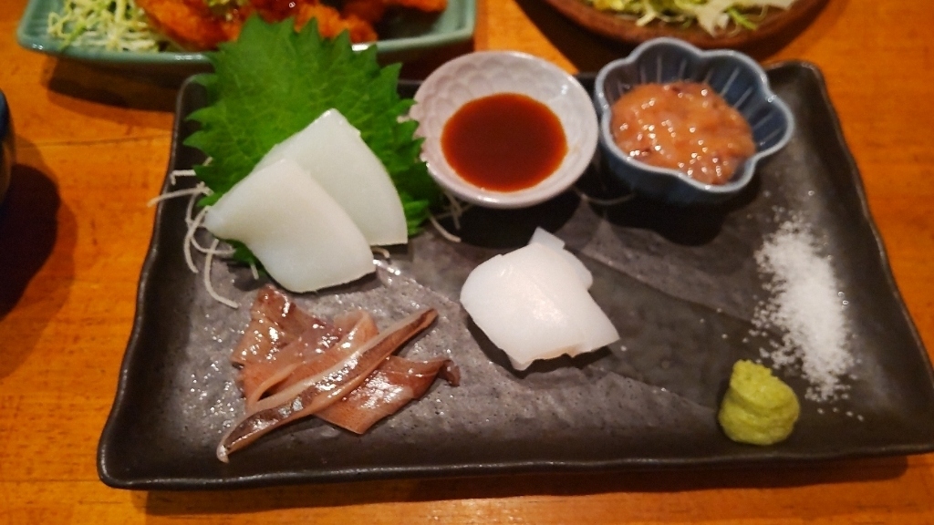イカ三昧はイカ刺、イカの塩辛、イカフライにイカと大根煮。