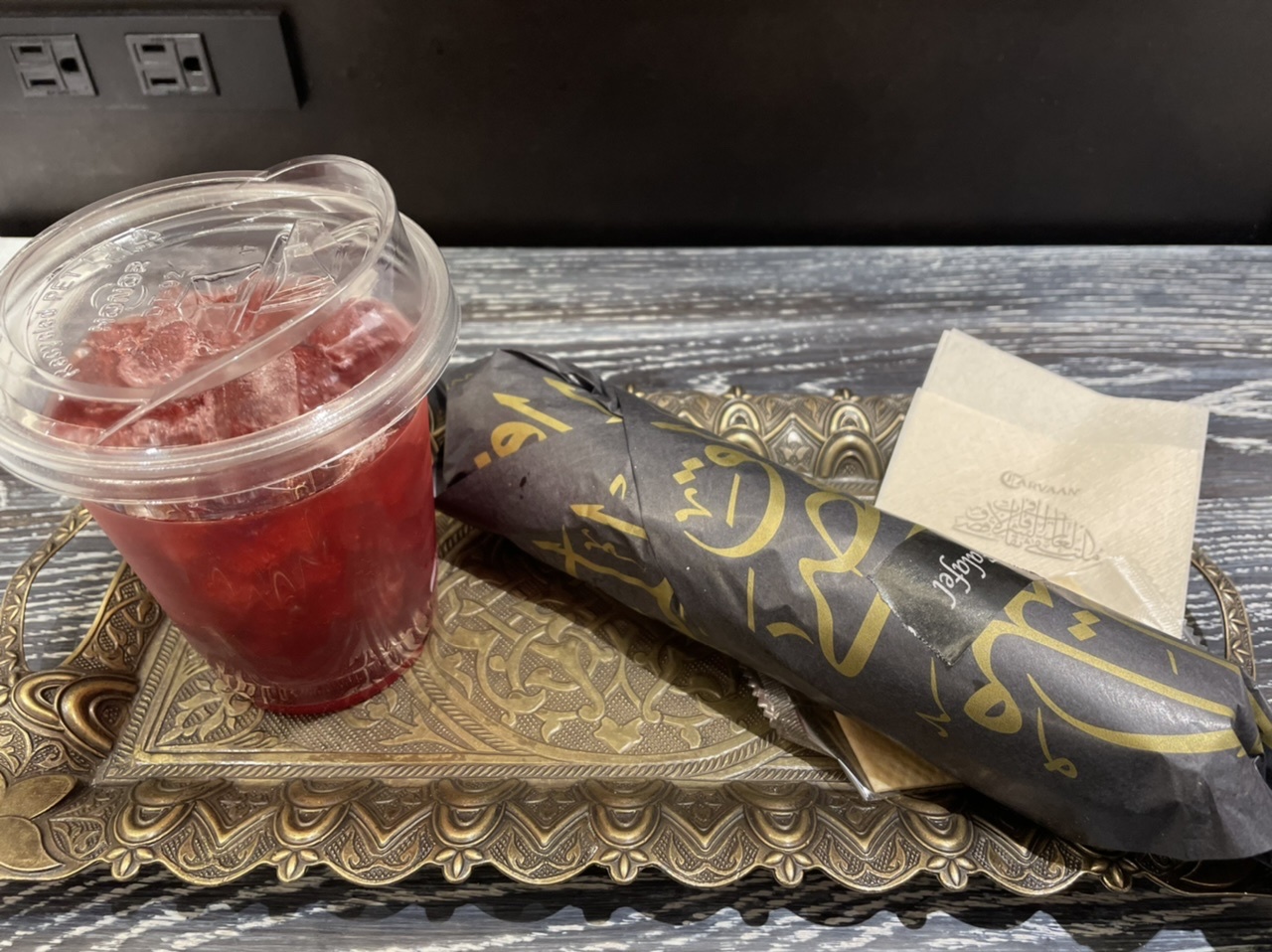 ファラフェルVeganシャワルマを注文。セットで飲み物が少しお得です、とすすめられたのでハイビスカスティーも注文しました。合計1600円くらいで値段は高めです。