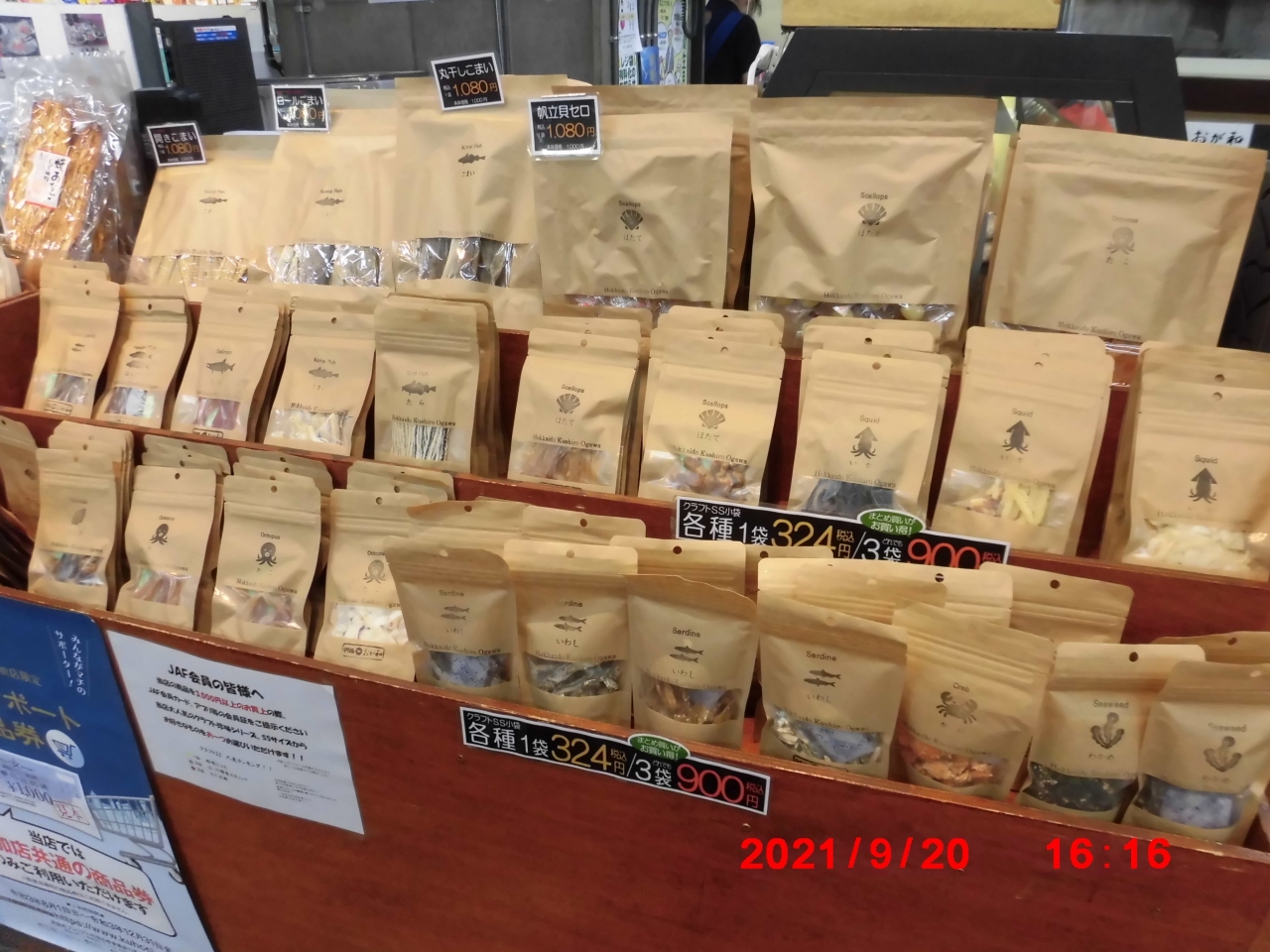 釧路市観光で立ち寄りました。おが和MOO店さんは、宿泊したホテルのすぐ近くにあったッシャーマンズワーフMOOの1Fにある「手造北海の味」が売りのお店です。例えば、一夜干しで有名な「こまい(氷下魚)」でも、開きこまい、ロールこまい、丸干しこまいの3種類があります。また、小袋になっているものを3袋買うと少しお安くなっているお好みセットもありました。
