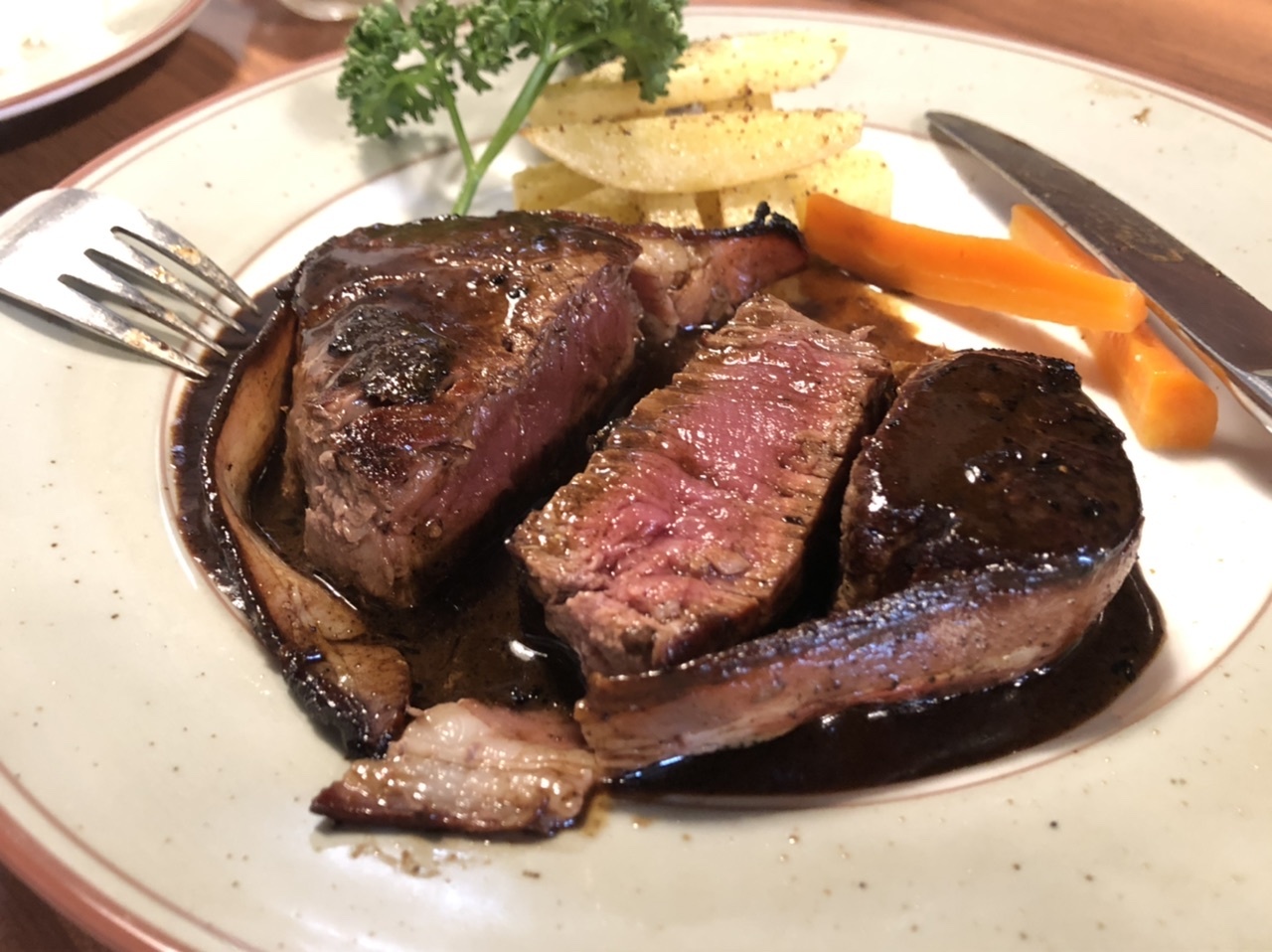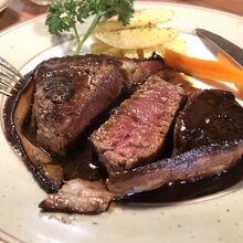 ご近所に住んでいる方から、ここはステーキが名物だときいたので、今回はステーキを頼んでみました。昔ながらのベーコンでくるりと巻いたステーキのスタイルがとても懐かしかったです。ただ、風味としてはベーコンは強いので、ない方が好みかなと思いました。