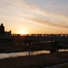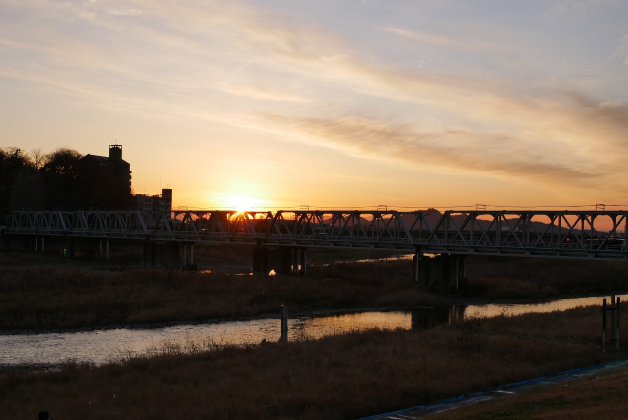 渡良瀬橋"で"(橋上)夕日を見ようと一旦渡りかけましたが、やはり渡良瀬橋越しの夕日の方がいいかな…と再び土手まで戻って眺めました。