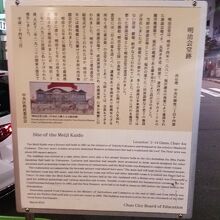 専修大学発祥の地のすぐ近くに説明板がありました。明治14年に福沢諭吉の発案で建てられた演説会場があったとのこと。「演説」と聞くと昔の小説とかに出てきそうで何となく場面は想像できるのですがそれを行う専用の建物があったとは驚きです。しかも説明板の絵によると3000人も入れる洋館風の大きな建物だったとかで二度驚きました。