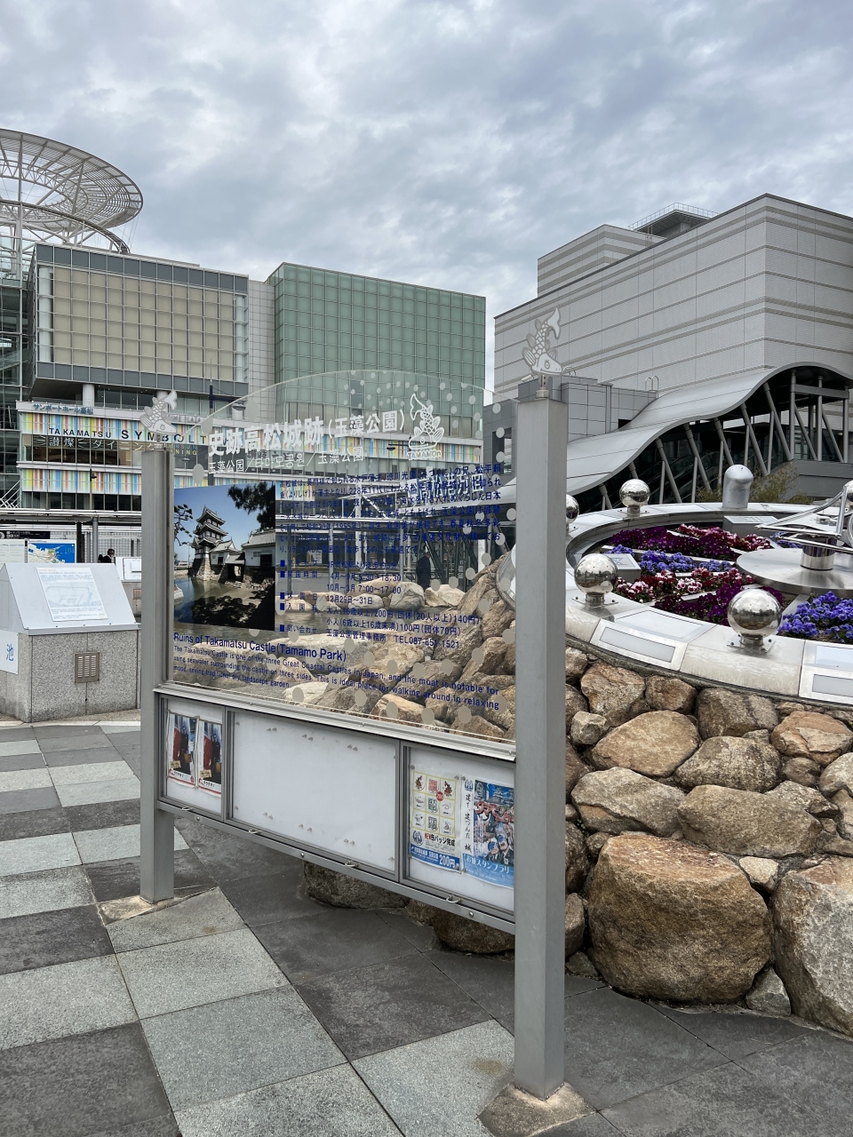 JR高松駅から琴電高松築港駅に向かうとあるのが史跡高松城跡。玉藻公園という名前でも親しまれている公園で、面積も大きいですし、お城のあともきれいに残っています。見学もしやすい場所で、駅だけでなく、バス停も目の前という立地はすばらしい。