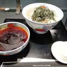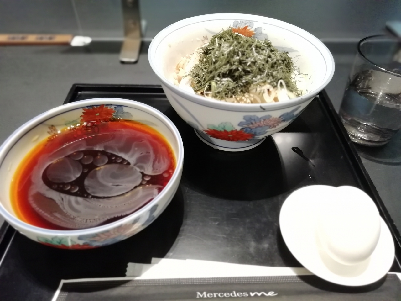 有名なお蕎麦屋さんとメルセデスベンツのコラボらしいのですが、まったく知らずに入りました。辛い蕎麦とは思っていましたが、麺つゆの味が濃すぎて、私の口にはあまりあいませんでした。ただ、コーヒーが100円で、ケーキも安く、カフェとしての利用はありだと思いました。インフォメーションの奥、皆さん電車を降りてすぐ上に行かれるので、人が少なく穴場だと思います。