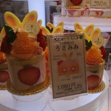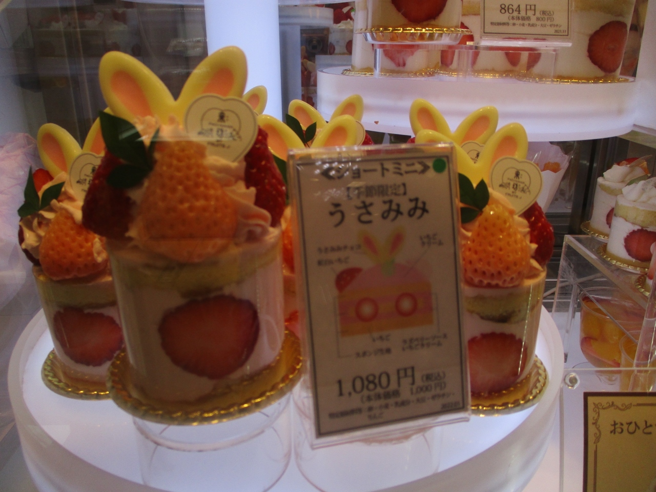 阪急百貨店の地下食料品売り場にお店があります。ジュレやゼリーなどが華やかなスイーツが多いと思います。中でもこれいいなと思ったのは季節限定商品の「うさみみ」。いちごがたっぷり使われていて、うさぎのみみが覗いているショートケーキです。お値段はわりとお高めですがかわいいです。