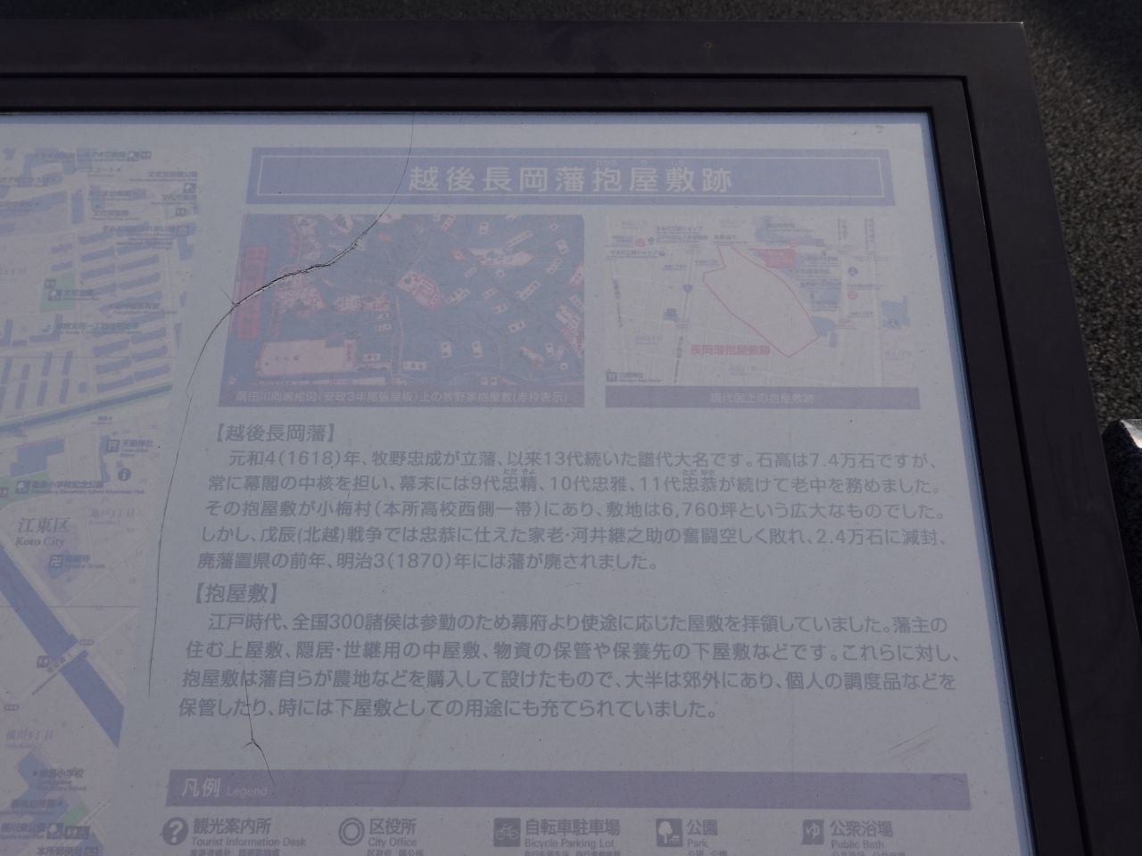 向島の桜橋通り沿い、都立本所高校近くに案内板があります。薄くなって少し読みづらくなっていますが、それによりますと、越後長岡藩は、7.4万石の譜代大名の藩ですが、幕閣の中核を担い、幕末には三代続けて老中を輩出した藩です。敷地6760㎡の広大な敷地の抱屋敷がここにあったそうです。抱屋敷というのは、藩が独自で土地を購入し個人の調度品などを保管した場所のようです。