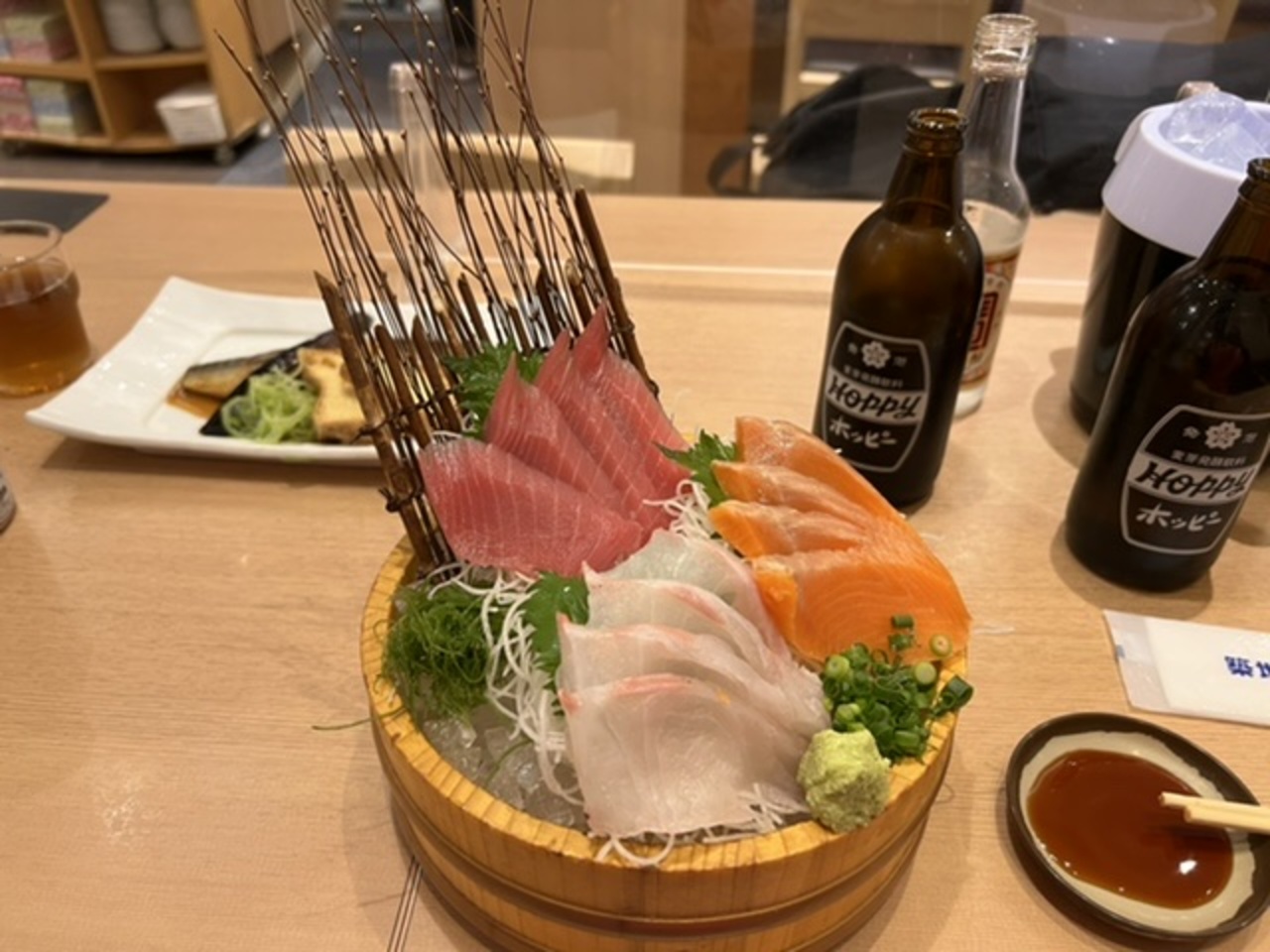 たのんだのはWホッピー焼酎セット、ホッピー2本に宝焼酎小瓶360mlに氷が付きます。魚は刺身盛合せに鯖の^_^味噌煮で。
