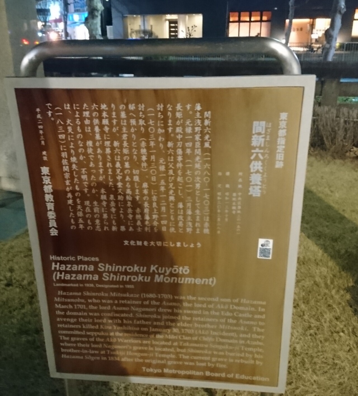 赤穂浪士の墓は主君浅野家の菩提寺である高輪の泉岳寺にあるのですが、なぜか間新六の墓だけはここ築地本願寺にあります。埋葬された理由は、檀徒であったからだったと理由もありますが定かではないそうです。築地本願寺の表門入ってすぐ右手に行くとあります。