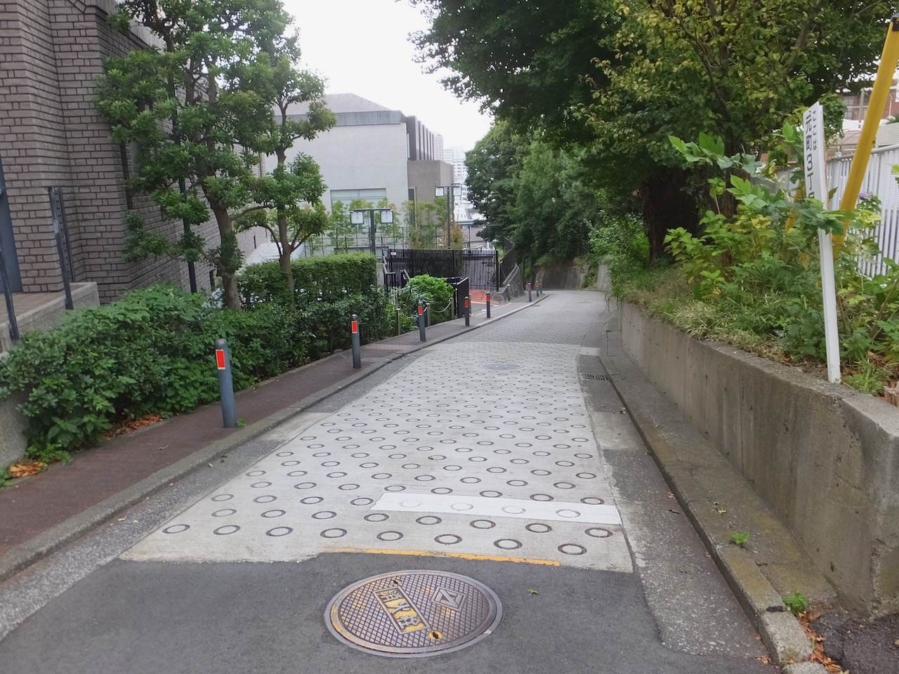 元町の商店街から丘の上の山手本通りに登る細い坂道。急坂なので滑り止めのエンボスがあるくらい。しかも細いので歩道も狭く、すれ違う時は車道にでなければならないくらい。坂上はフェリス女学院で街灯もおしゃれでちょっと文教的な香りのする雰囲気でした。