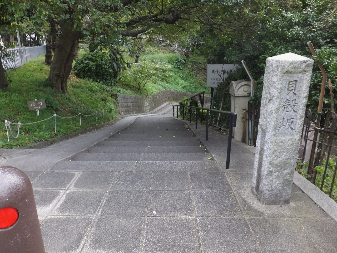 元町公園と外国人墓地の間を通る階段の坂道です。どちらも緑深い区画なので時間帯によってはちょっと暗い雰囲気になるかもしれません。坂の名称の由来は貝塚があったからなのだと思います。下っていくと元町商店街のいちばん端に出る便利な抜け道でもあります。