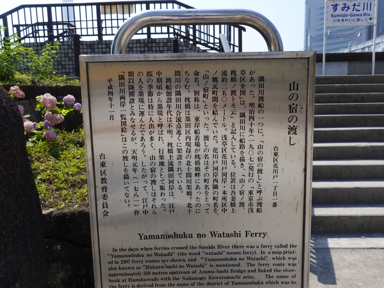 浅草駅から隅田公園を少し北に歩いたところに、碑が立っています。これが、山の宿の渡し碑です。隅田川の渡船の一つに、山の宿の渡しという名前のものがあったそうです。花川戸河岸西側の町名が山の宿町だったそうです。渡船しかなかった時代は、隅田川の両岸を行き来するのは大変だったと思います。