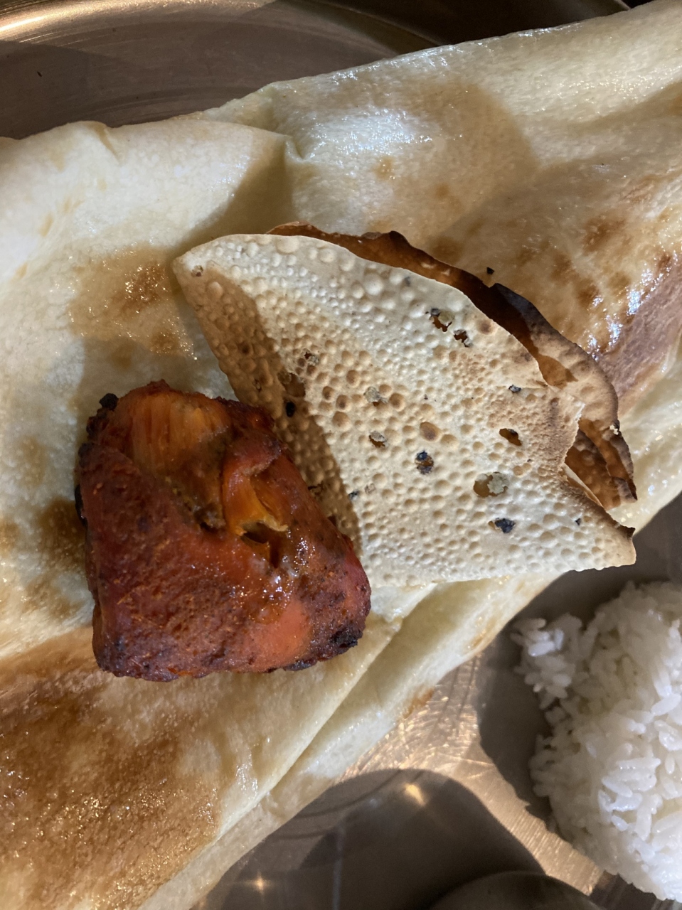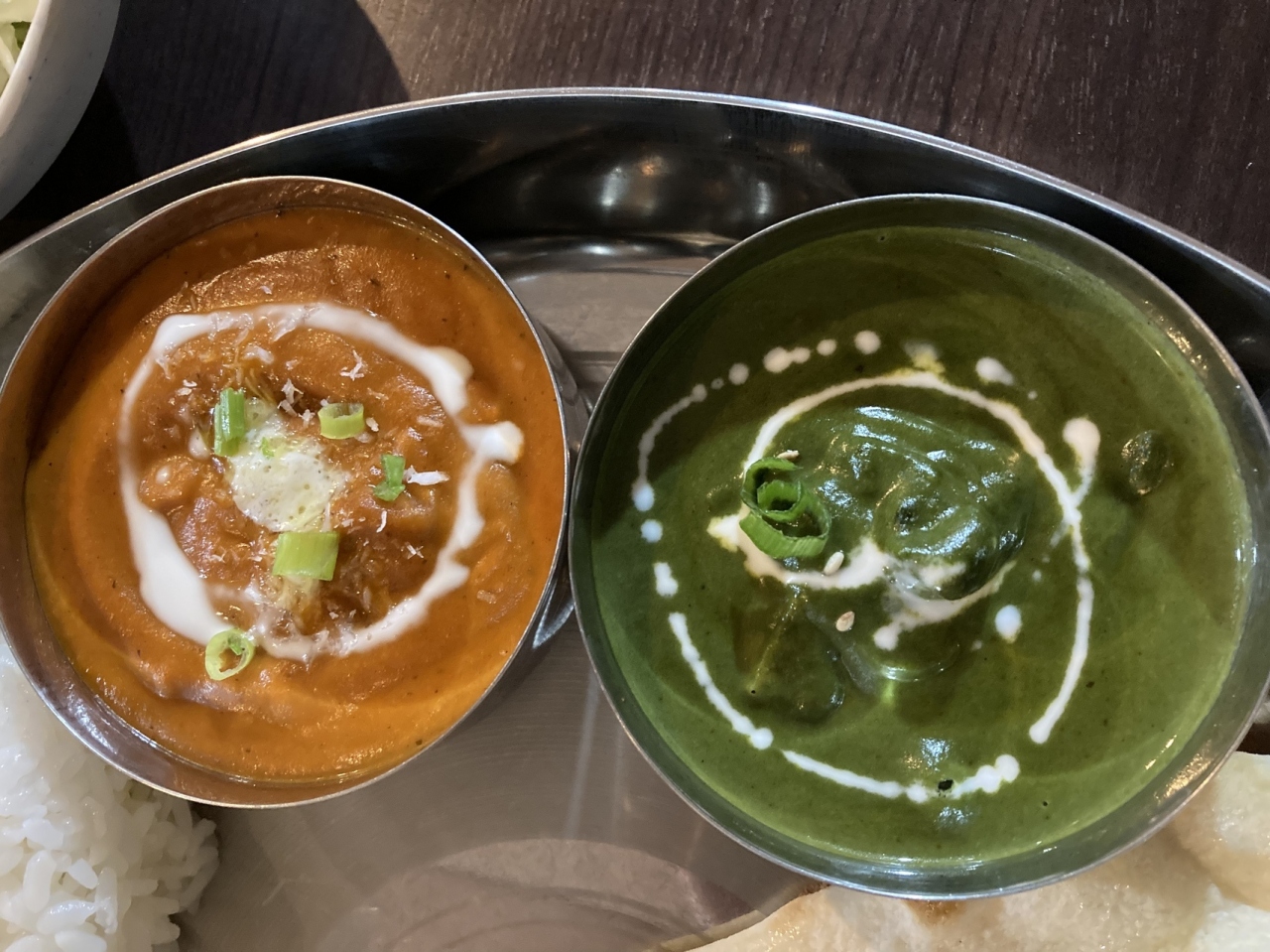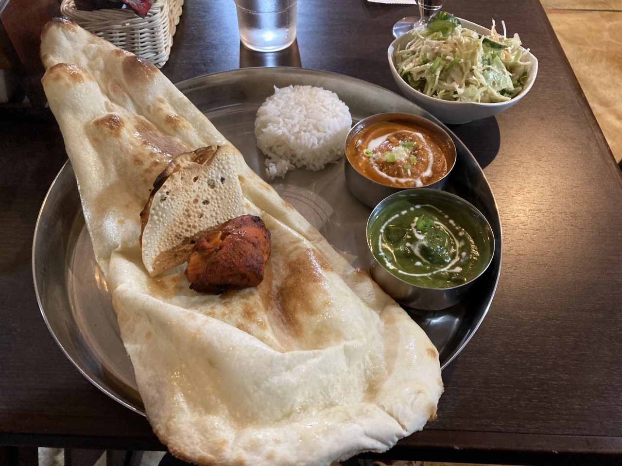 待つこと5分、セットが到着。バターチキンカレーは、コクがありマイルド、中辛にしたのであとから少し辛さがやってくる。スパイスの風味もちょうどよく、酸味も強すぎないので日本人にも合う味。サグブラウンカレーは、見た目よりも辛いものの、エビの出汁とほうれん草の旨味が合わさり美味。どちらのカレーもナンでもライスでも合う。チキンティッカパバドはお肉の脂かしっかり取れていますがパサパサせず美味。マンゴーラッシーは、辛さを抑えるのにちょうどよい飲み物でした。次回はネパール料理に挑戦してみよう。