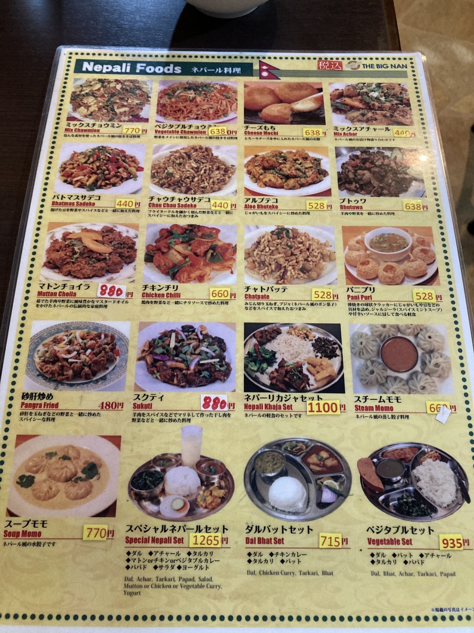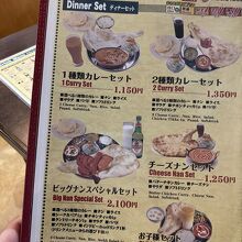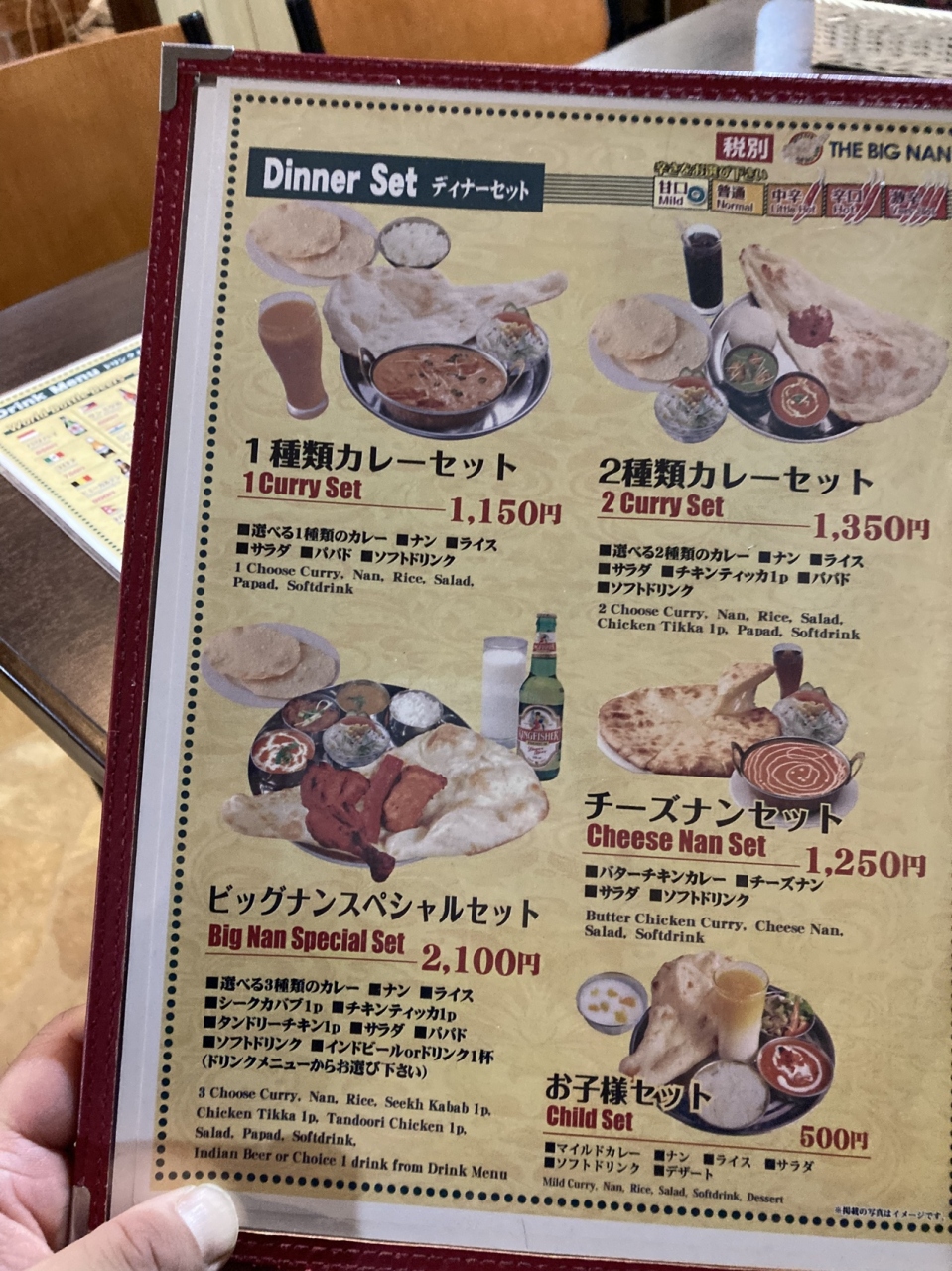 お店の前に貼ってあるバターチキンカレーに惹かれて訪問。メニューを見るとインドカレーだけでも、チキン、マトン、ポーク、キーマ、シーフード、ベジタブルとかなりの種類(この他ネパールのダルバッド(一人向けの食事)のカレーセットやタイ式のグリーンカレーもある)。ディナーにはカレーをメインにしたセットもあり、「2種類のカレーセット」(1350円)をオーダー。カレーは、バターチキンカレーとサグブラウンカレー(ほうれん草とエビのカレー)、飲み物はマンゴーラッシーを選択。このセットには、インドのお米で炊いたライス、大きなナン、チキンティッカパバト、サラダも入っておりかなりお得感あり。カレーの辛さは、甘口・普通・中辛・辛口・激辛の5種類。少し辛いものをということで中辛を選択。