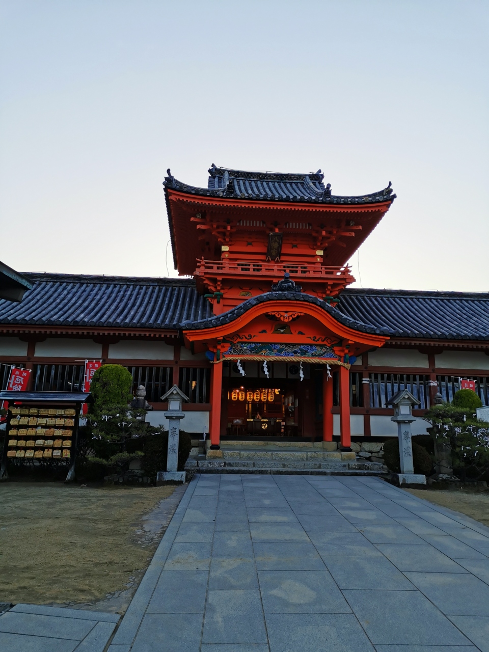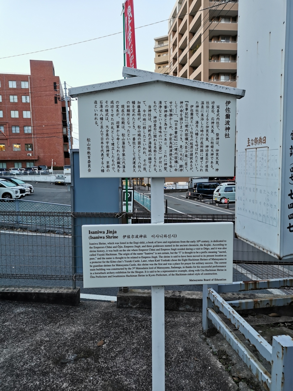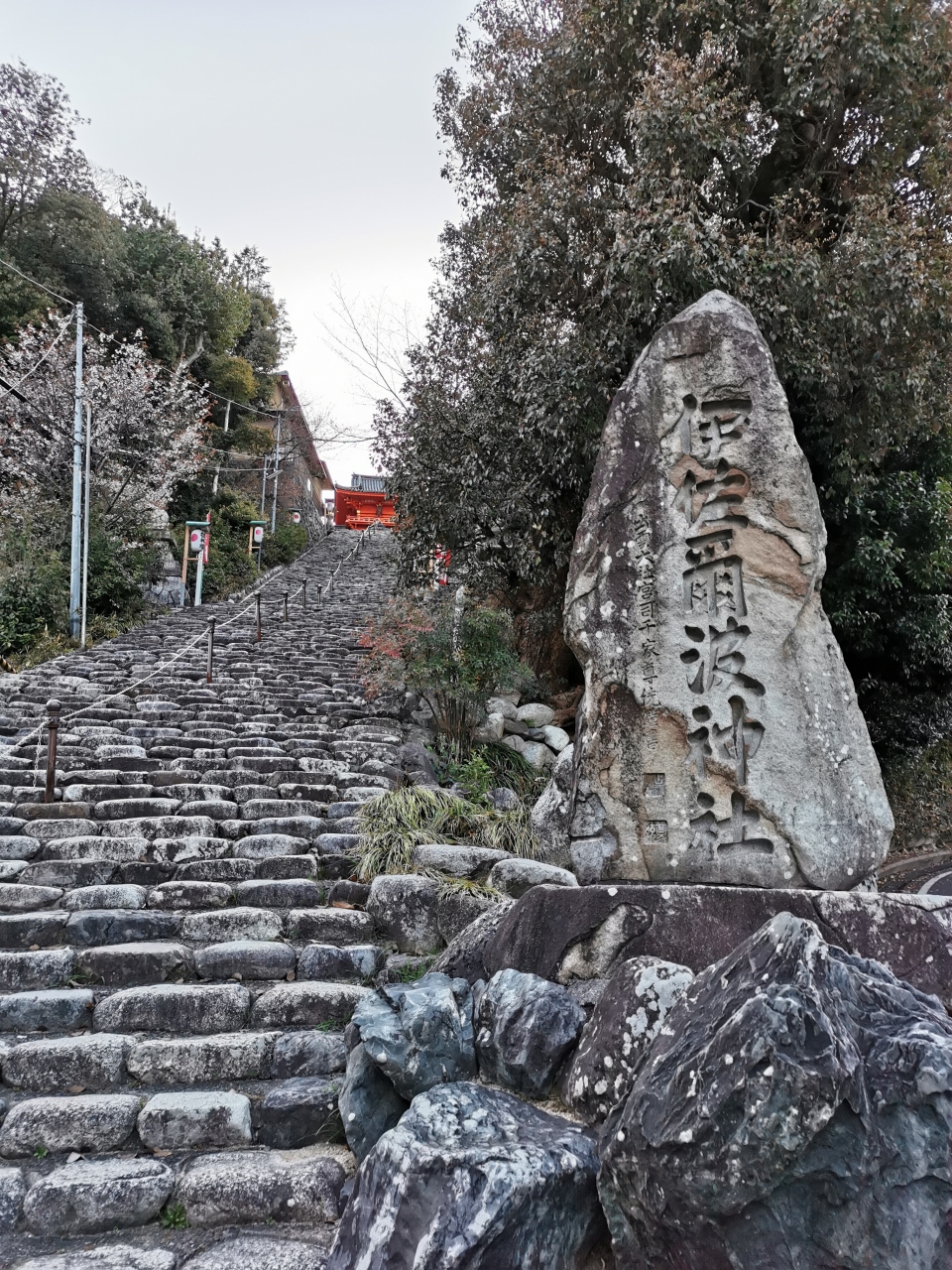 西日本ドライブ一人旅。松山市の大街道に近いホテルに宿泊。翌朝、せっかくですので車を道後公園の駐車場に停めてから自転車で道後温泉界隈を散策しました。道後公園から道後温泉に向かう途中、坂の上にある伊佐爾波神社に参拝立ち寄りしました。長い急な階段を登ると本殿があります。上からは松山が一望できます。