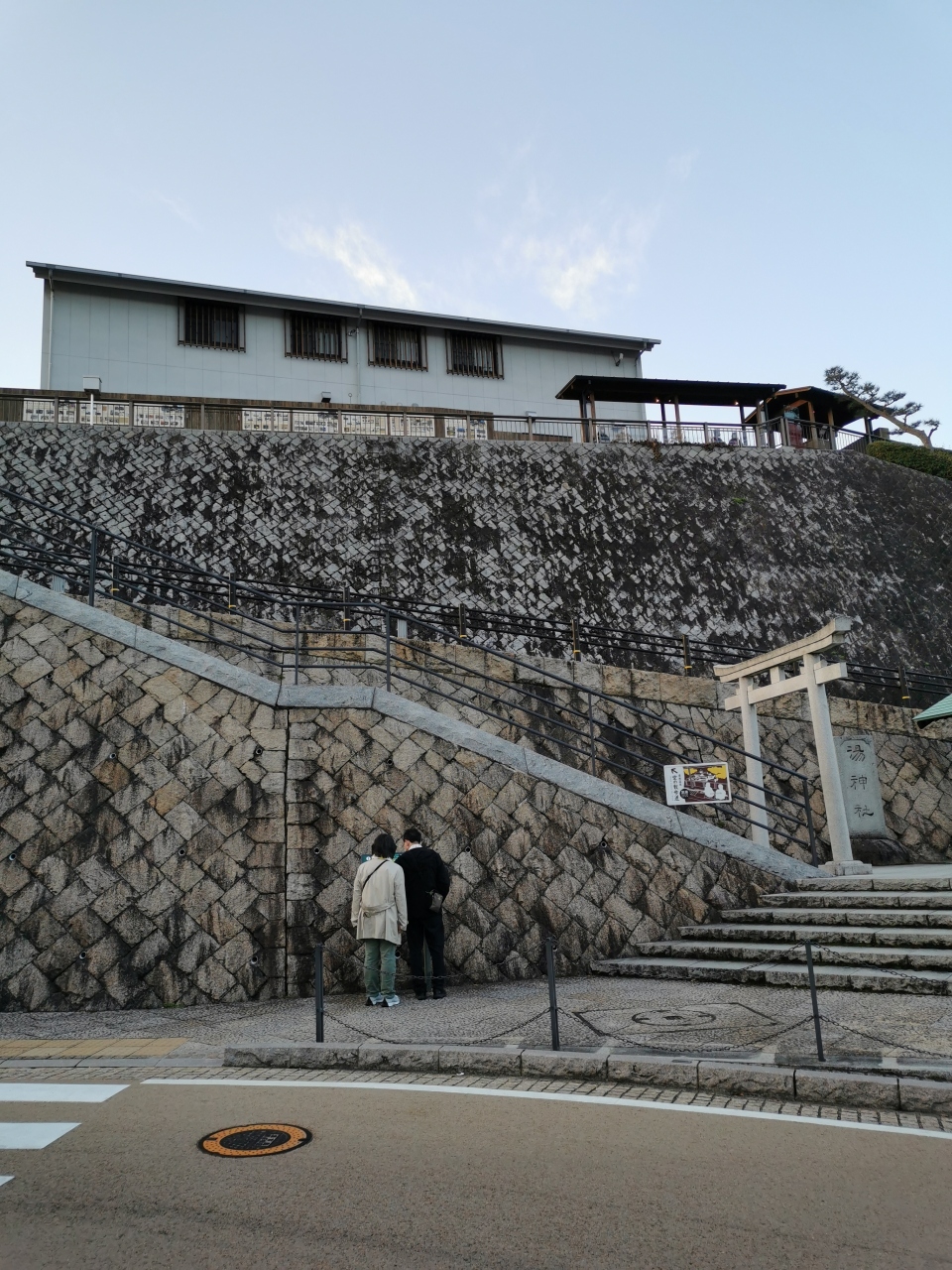西日本ドライブ一人旅。松山市の大街道に近いホテルに宿泊。翌朝、せっかくですので車を道後公園の駐車場に停めてから自転車で道後温泉界隈を散策しました。道後温泉の本館はただいま改修工事中でした。早朝から入湯客で行列ができていました。道後温泉 空の散歩道は道後温泉横の湯神社の辺りにある足湯施設。急な階段を登っていかなくてはなりません。でも早朝から浴衣の観光客が登っていました。さすがの観光地です。