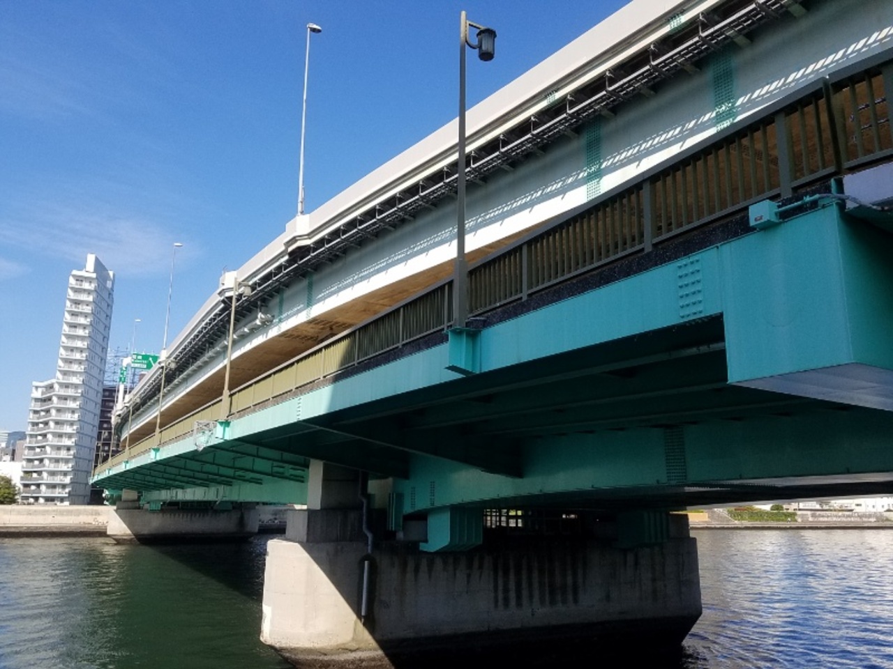 隅田川に架かる永代橋と清洲橋の間の橋です。永代橋と清洲橋が見た目も美しい重要文化財なのに比べてこちらは上に首都高速9号深川線が走り箱崎ジャンクションに繋がる機能的な橋ですね。下の橋に歩道があるので永代橋とや清洲橋を真横から見たい時にもおすすめですね。