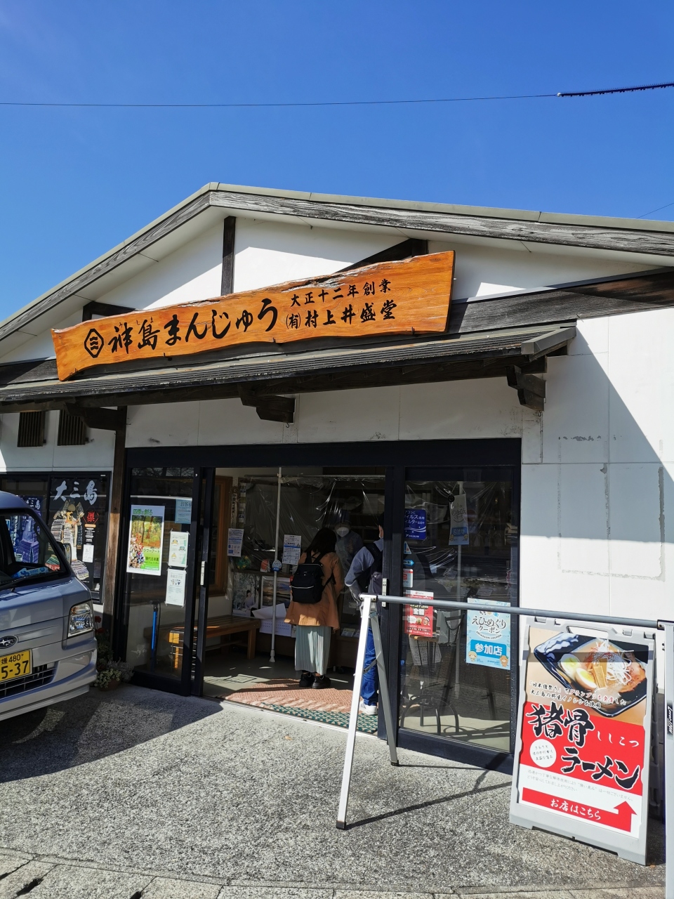 西日本ドライブ一人旅。今治市からしまなみ街道を通って大三島に行きました。大三島ICを降りて大山祇神社に向かいました。道の駅・しまなみの駅 御島は大山祇神社の真横です。こちらの駐車場に停めて大山祇神社を参拝しました。参道入り口、目の前にある「村上井盛堂 大山祗神社正面店」でお土産の神島まんじゅうを買いました。評判上々で美味しいです。