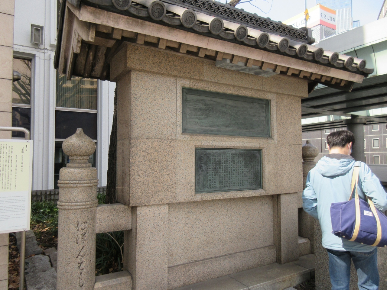 日本橋の由来が銅板に彫られていて、その銅板自体が緑青がふいていて、かなり読みづらいです。銅板だけでなく、橋の欄干や瓦屋根も乗っていて、このモニュメント自体がとても日本的で、手の込んだ芸術作品に見えてきました。