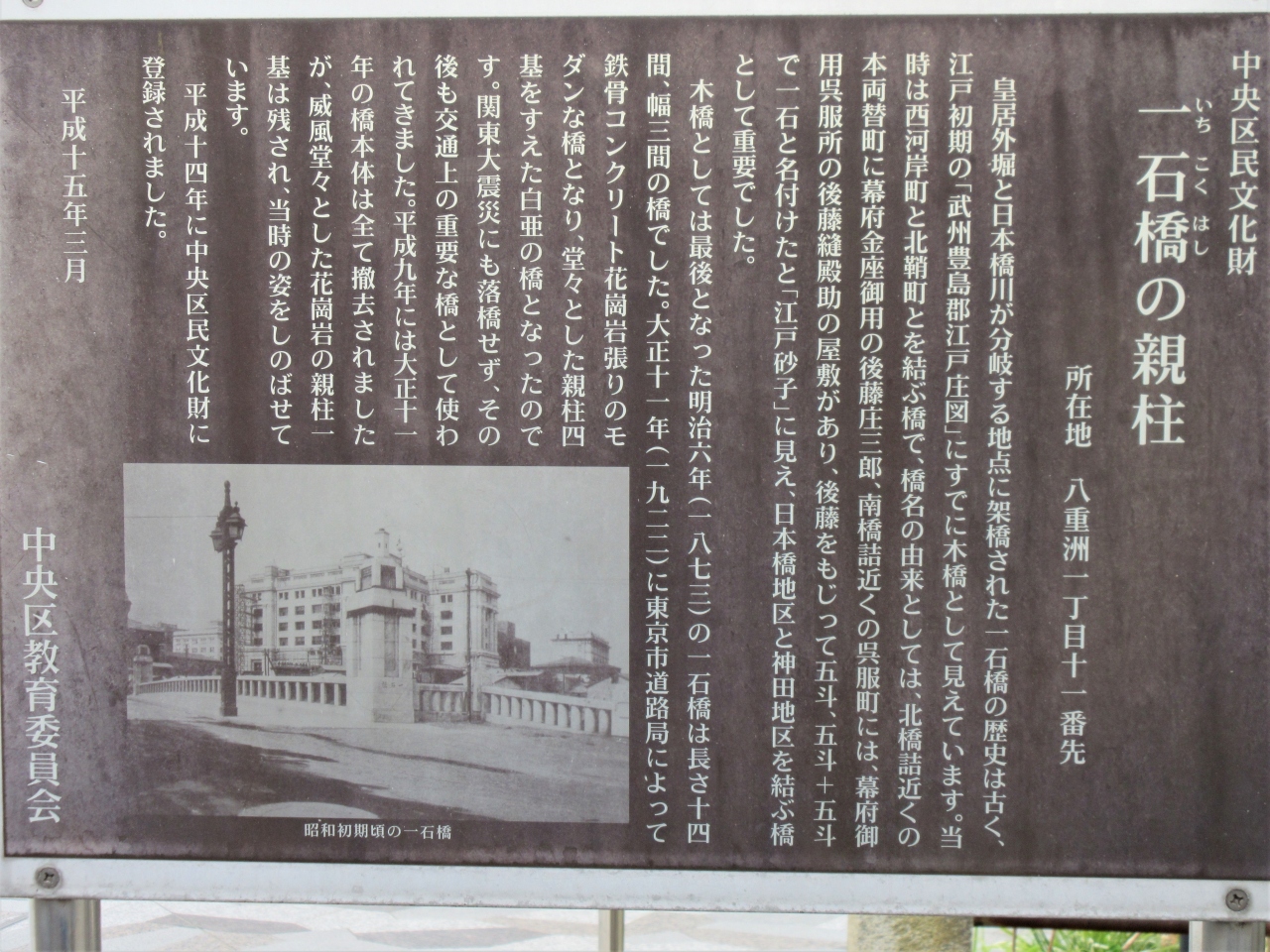 平成9年(1997年)に全て建て替えられた際、この親柱1基のみ中央区民文化財として残されたそうです。