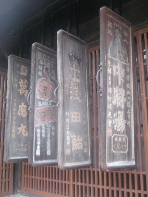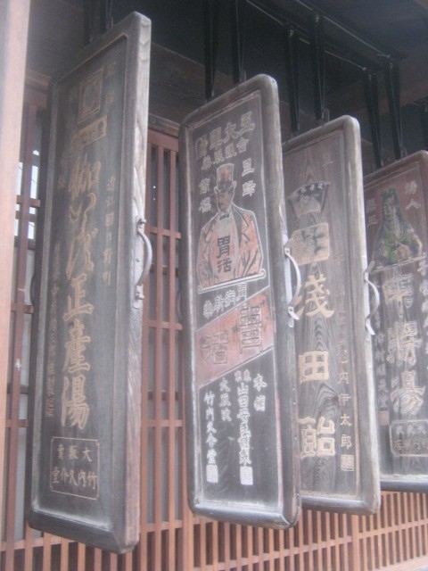 北国街道の木之本宿の文字通り本陣が置かれた場所にある薬局で、現在も隣接の近代的な建物として現役の薬局営業もされています。ただ、観光客的な見どころとしては、やはり歴史的建造物として有形文化財となっている建物の前に吊るされている7枚の木製看板で、表裏でデザインが異なっていますので、両側からじっくりとご覧になることをお勧め致します。