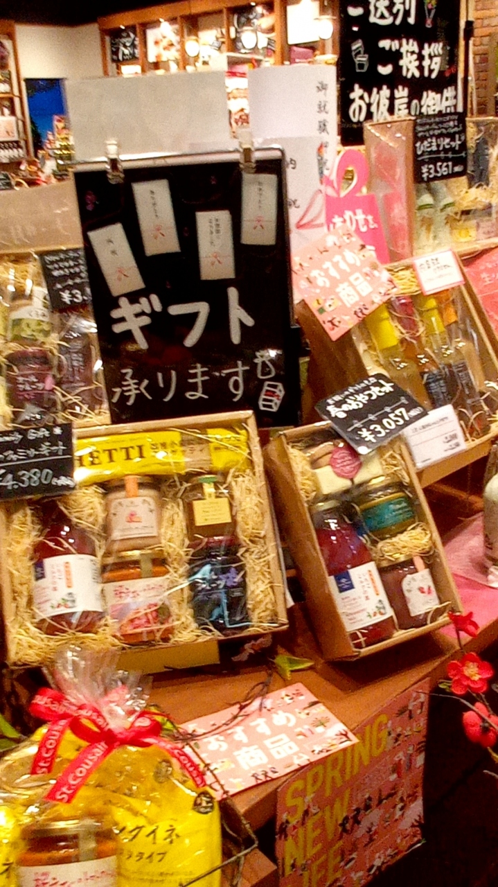 埼玉県 越谷の「越谷イオンレイクタウン」1F に出店している「サンクゼールワイナリー レイクタウン店」を訪れました。店頭には、春の御挨拶などの際にも利用しやすいギフトラッピングされた商品がいろいろと販売されていました。