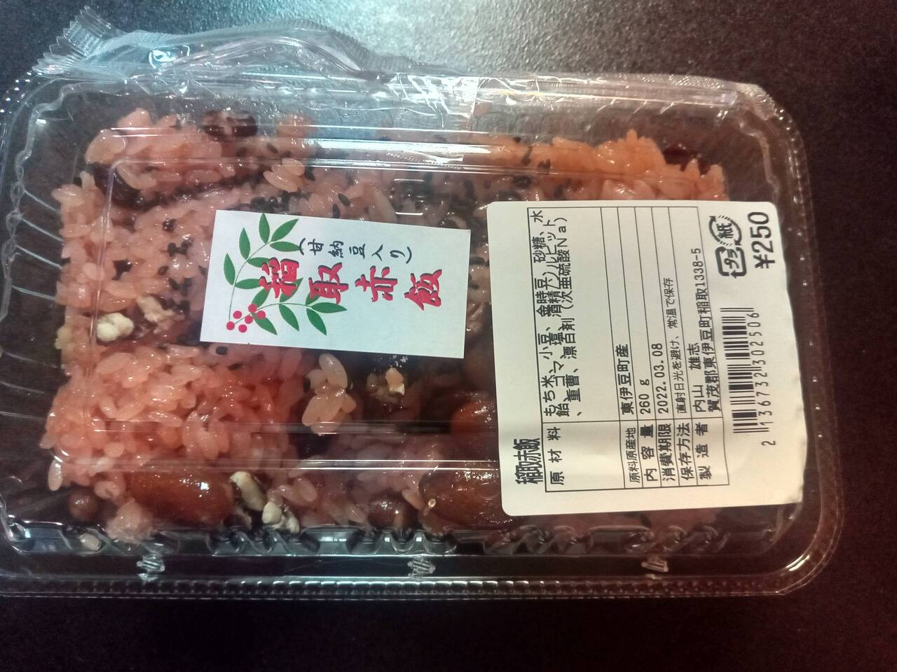 稲取の「金目鯛」をはじめ、海産物やフルーツ、おみやげ商品などが販売されていました。「稲取赤飯(甘納豆入り)」という、ご当地グルメが販売されていたので購入しました。