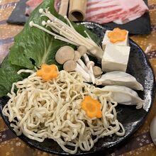 あぐー豚肩ロース、バラ、もも、やんばる若鶏つくね、島豆腐、エノキ、葉野菜、あぐー豚餃子、〆の沖縄そば、と一通り揃っています。