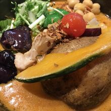 券売機でチケットを買うと好きな席に座って待つ。5分程度か,かなりの速さで注文したチキン野菜のスープカレーが提供される。ご飯は雑穀米を選んだが,ほんのり塩味。普通盛りだが一般的には大盛りに近い印象。カレーには、小ぶりのチキン一切れ、大きなじゃがいも丸ごと一個、ささがきごぼうの素揚げ、ピーマン、ナスなど盛りだくさん。野菜を多めにとりたい時におすすめ。
