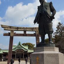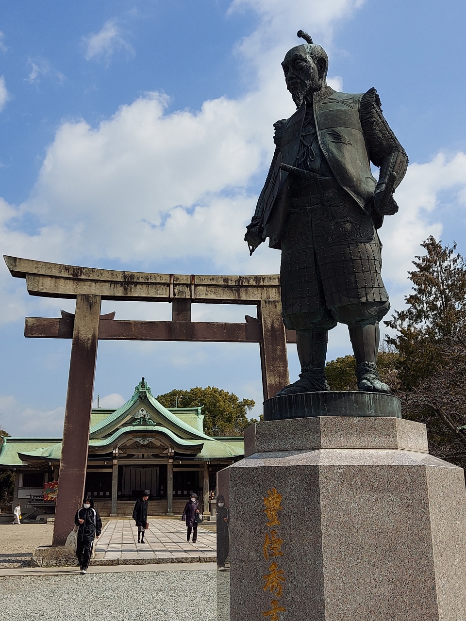秀吉関係の神社にしては、簡素なつくり。京都の豊国神社の煌びやかさとくらべると、質素な感じすらします。大きな秀吉の像がありますが、武将姿の立像。京都が関白の装束で座った像だったのにくらべても、大阪では戦をしている秀吉のイメージ?