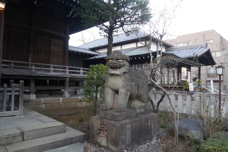 こじんまりとしていますが、とても歴史のある神社だそうです。この神社周辺は道の形状が面白く、おそらくここに神社が昔からあって、その後土地を切り売りするうちに定まってきたのかな…と感じさせられます。また、拝殿の両脇にいる狛犬の眼光がするどい!なんと、ゴールドです。