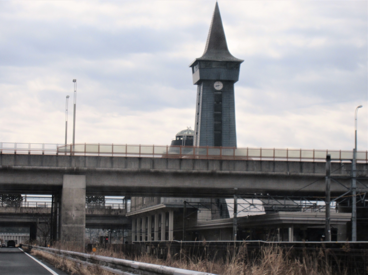 国道464号線を走っていて、ロケットのような尖塔が立っているのを見て。いつもドキッとします。近づいてみると、時計台のようにも見えるし、教会の尖塔のようにも見えます。