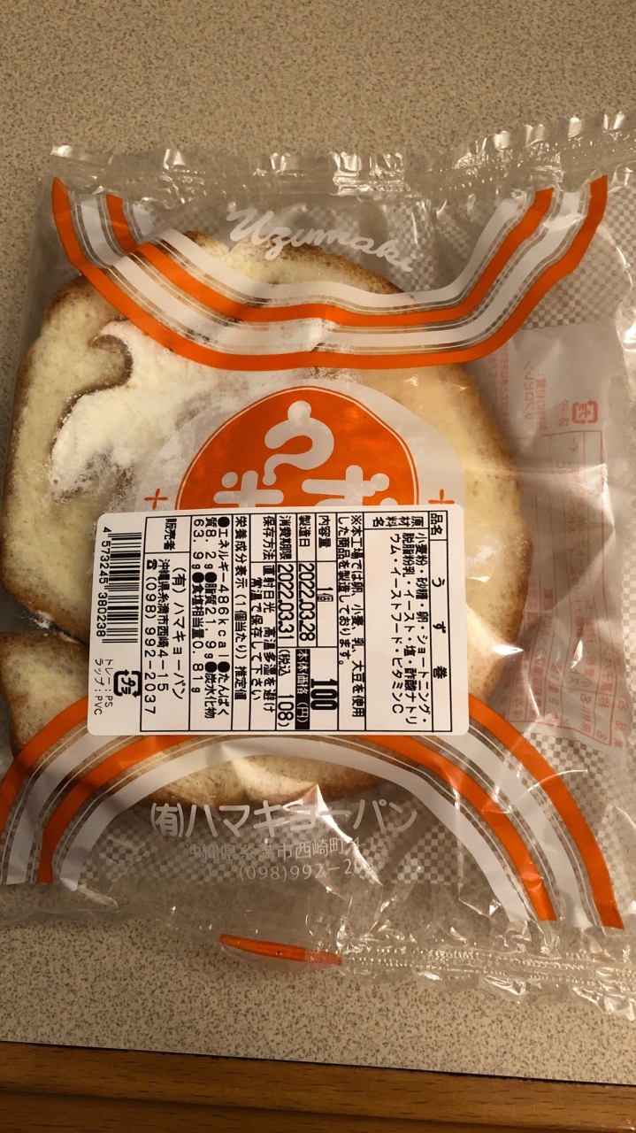 沖縄本島のパンといえば、ぐしけん・オキコなどが有名です。どのスーパーでも売られています。これに対してハマキョーパンは、本島南部のスーパーにしか商品が出回っていないレアなパンメーカーです。今回は、イーアス豊崎のイオンで、うず巻パンを買いました。