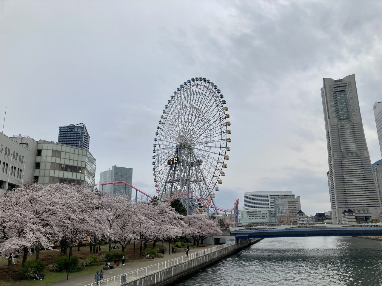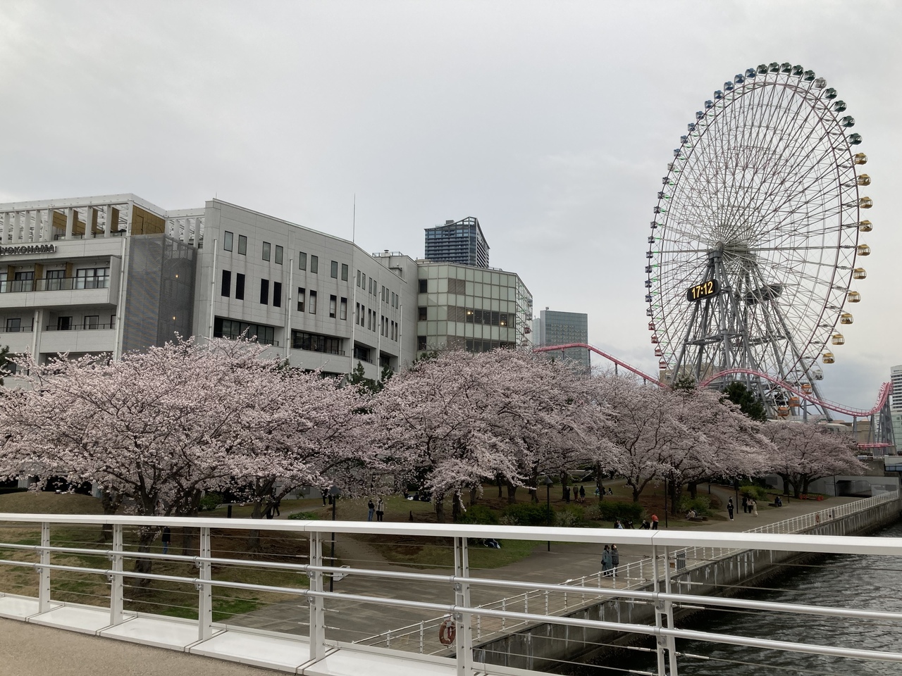 橋の上から桜を眺めました。ランドマークタワーと観覧車、それにカップヌードルミュージアムパークの桜が見えます。