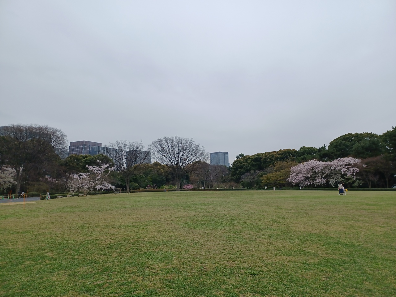 広い芝生が広がっており、ところどころにさくも咲いてました。春休みだったので遊んでる子どももいました。