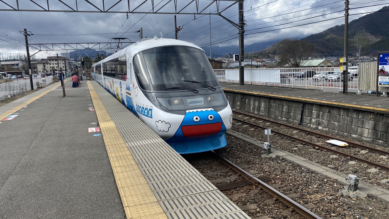 バブル経済真っ盛りの時に小田急が作った特急車両です。元々は中間車に2階建て車両がありましたが、富士急行に来る時に平屋の3両編成になりました。1両は指定席で、2両は自由席です。富士山駅から河口湖駅は距離は短いですが、特急料金は不要です。